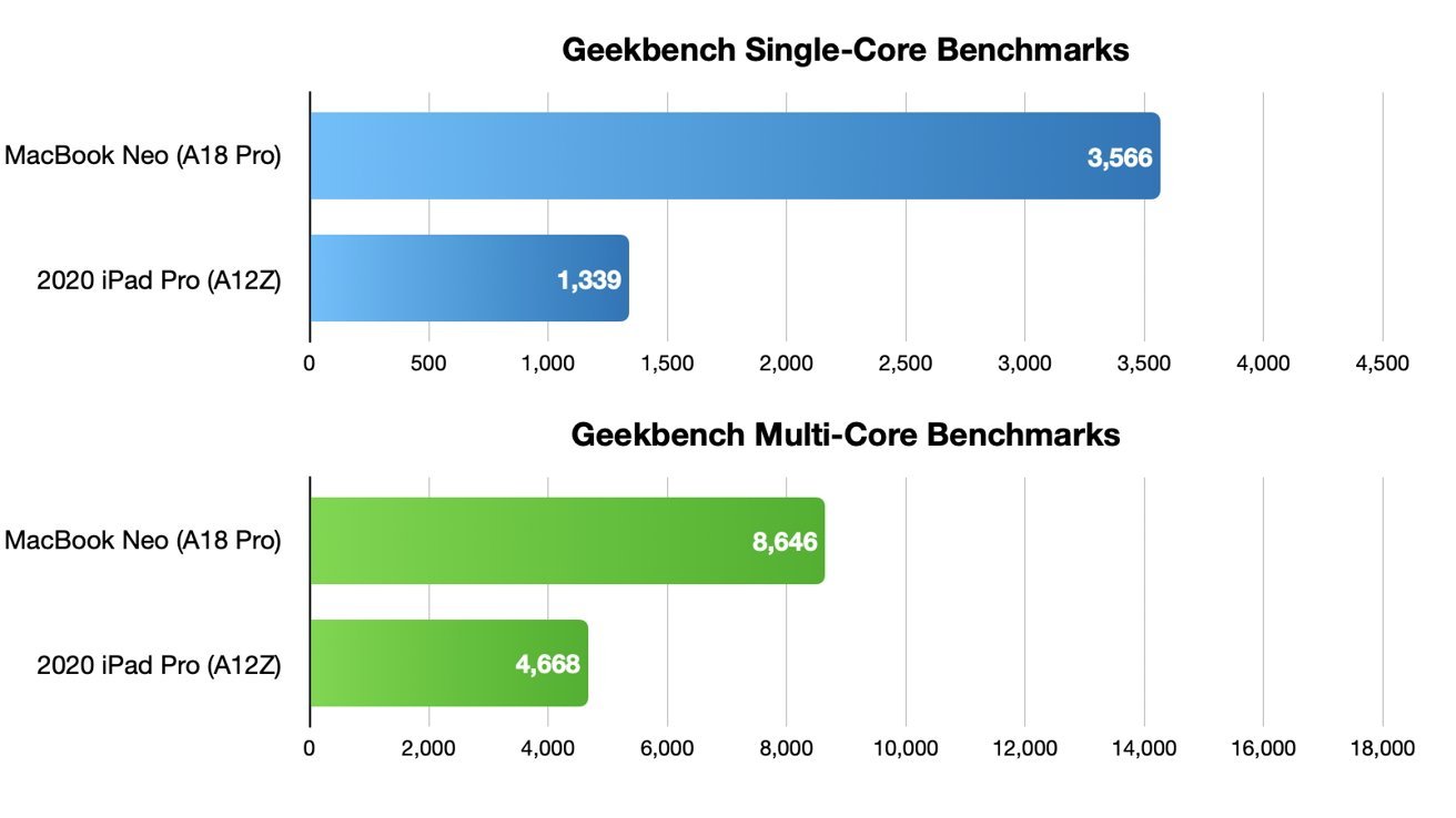 MacBook Neo 的 A18 Pro 芯片明显强于 2020 年 iPad Pro 和 DTK 里的 A12Z。