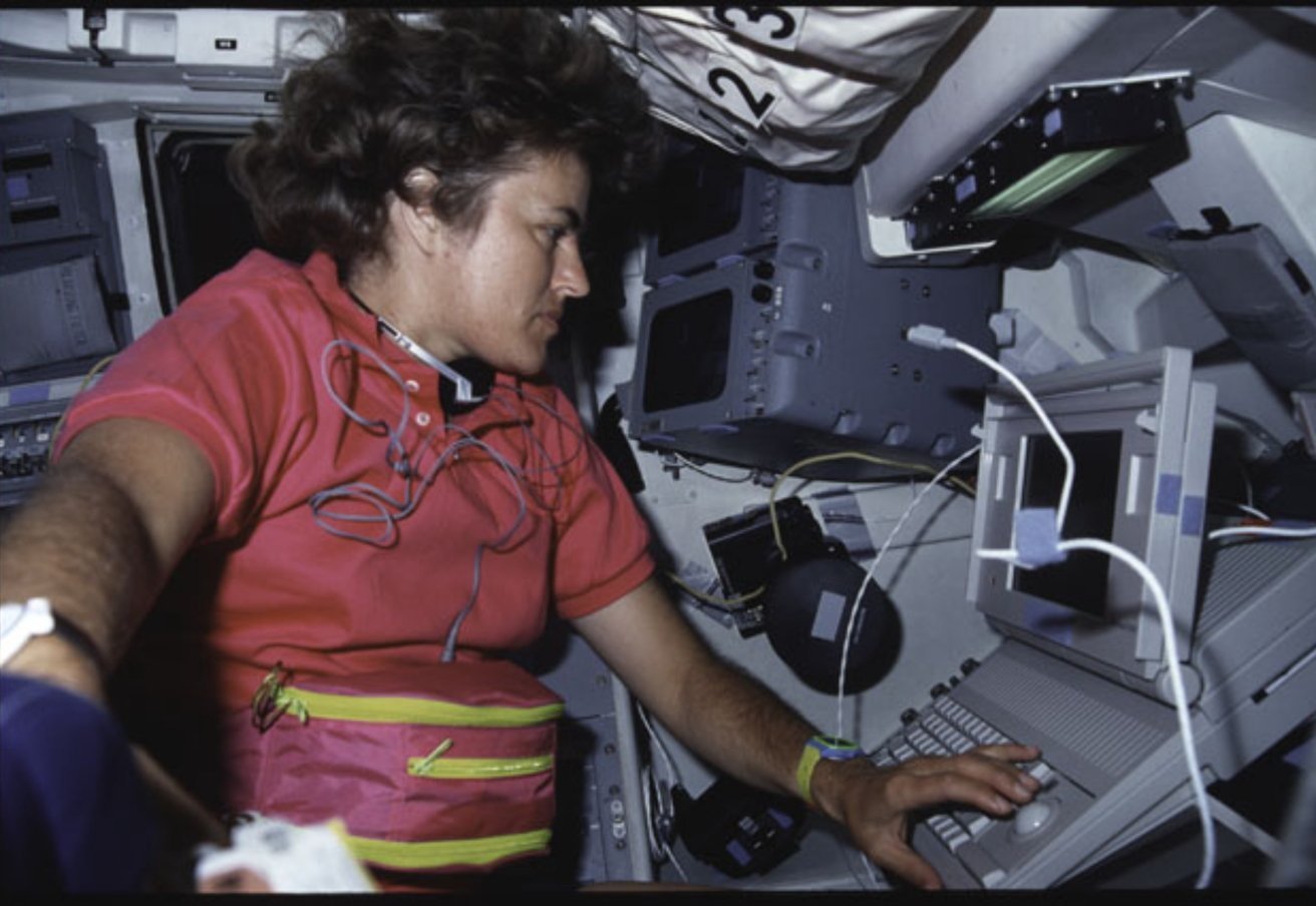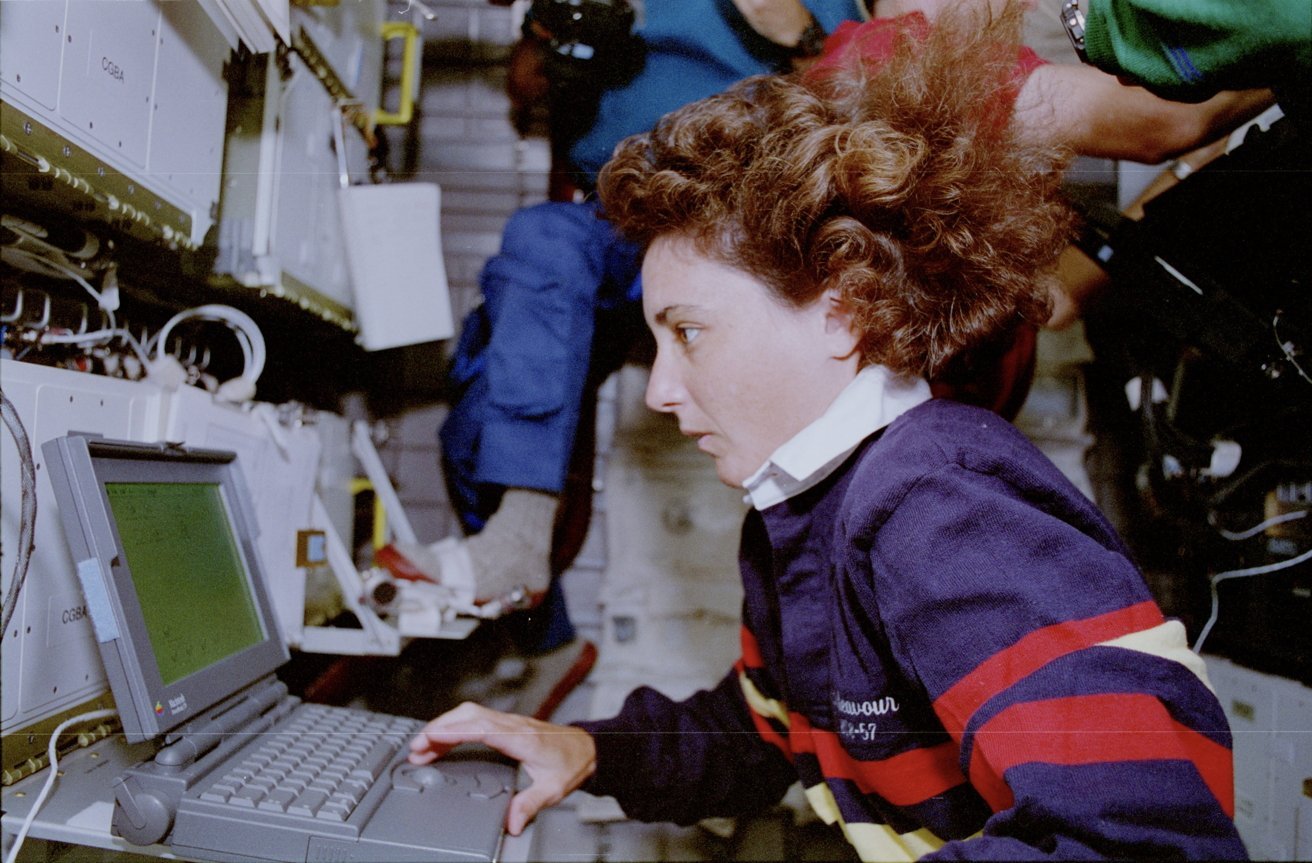 宇航员 Shannon Lucid 在亚特兰蒂斯号航天飞机上使用 Macintosh Portable