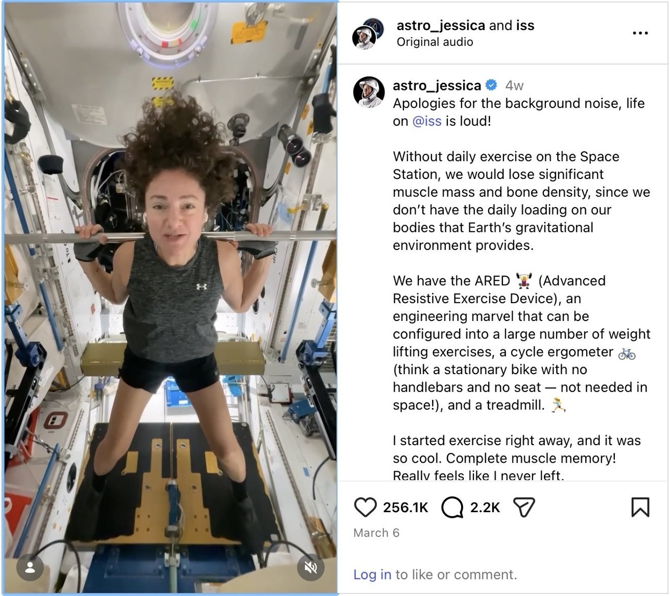 2026 年 3 月,NASA 宇航员 Jessica Meir 从空间站分享了一段健身视频,她锻炼时明显戴着 AirPods。ISS 机组每天都要用跑步机和阻力设备对抗肌肉和骨质流失。