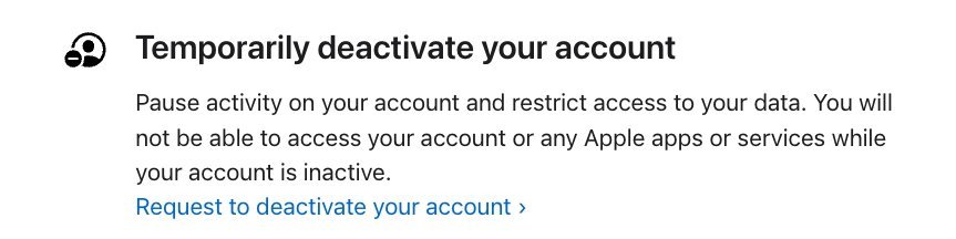 与删除数据不同,停用会完全暂停对 Apple 账户的访问,包括与其关联的所有数据。在 Apple 端,对这些数据的处理和访问几乎完全停止。