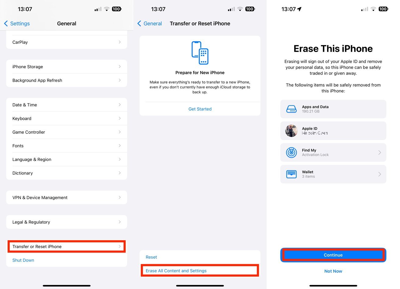 - 点击“抹掉所有内容和设置”。点击“继续”并按照提示完成操作。