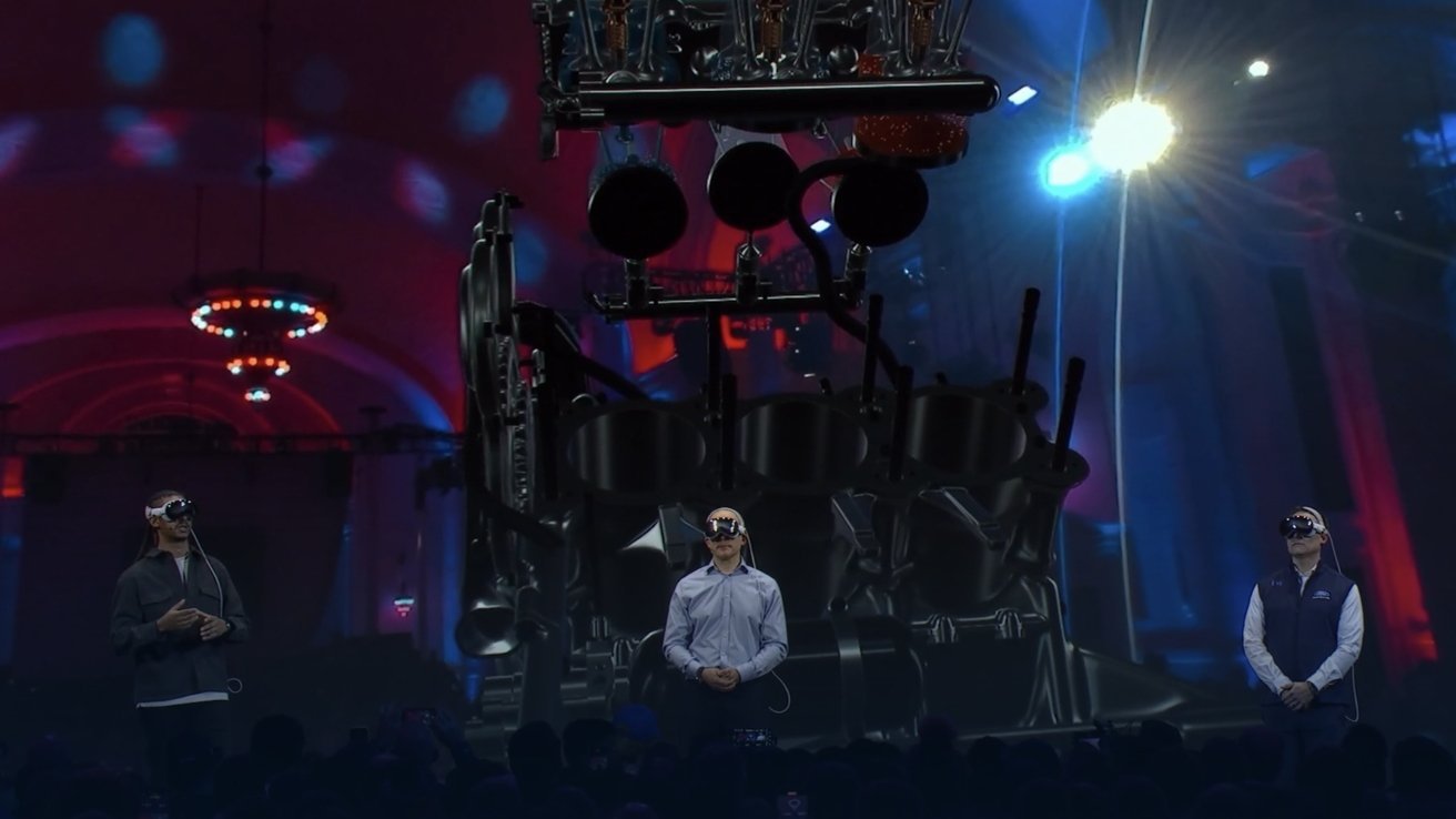 Apple Vision Pro同样成为焦点。在介绍红牛福特动力总成相关环节时,主持人直接佩戴头显登台,将其作为演示核心工具,而非旁枝末节的展示。