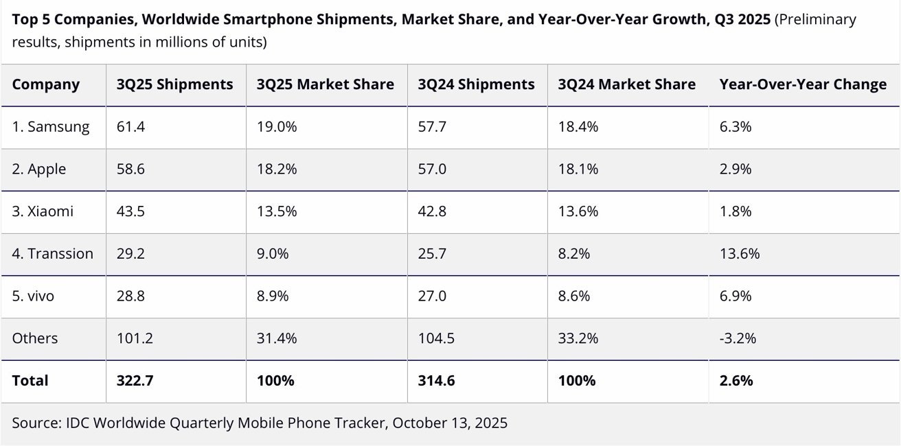 2025年第三季度全球智能手机出货量达3.227亿台,苹果与三星市场份额不相上下,共同领跑市场。