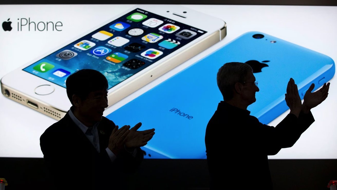 蒂姆·库克(右)站在iPhone 5c的宣传材料前