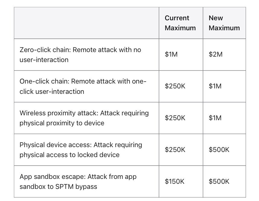 如今,苹果宣布将提高赏金,并提供其所谓的”加速奖励”。具体而言,苹果表示,自2025年11月起,其最高单笔奖励将翻倍至200万美元——并且通过奖金系统,该金额可能增至500万美元。