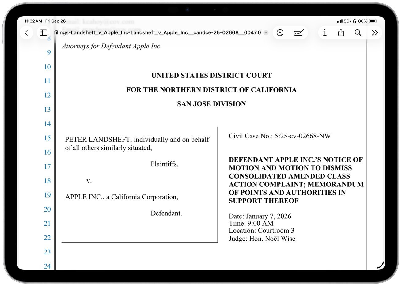 怀斯法官将于2026年1月7日听取辩论。如果苹果胜诉,此案将在证据开示前结束,苹果得以避免其内部开发过程被公开审查。
